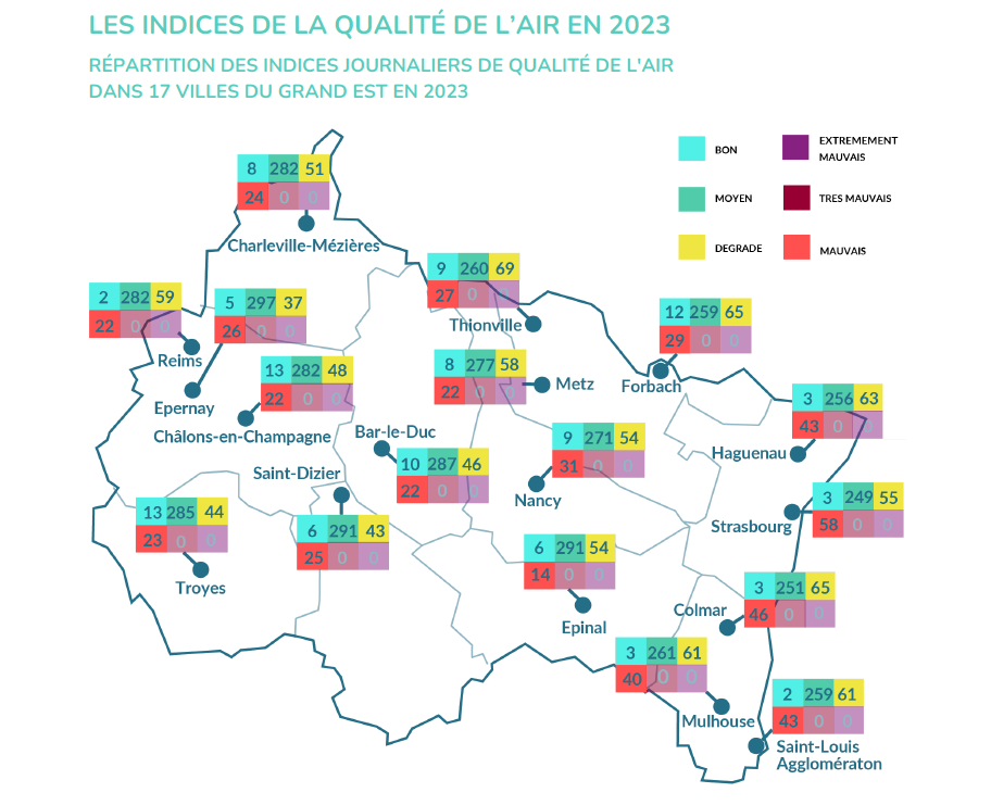 Par rapport à 2022, les indices de qualité de l’air ont été globalement meilleurs en 2023, sauf en Alsace. À noter que lorsque la qualité de l’air a été mauvaise, c’est l’ozone qui est responsable (75 %). Viennent ensuite, les particules PM2,5 (27 %) et, dans une moindre mesure, les particules PM10 (4 %). Les dépassements en ozone se situent essentiellement en Alsace du fait de sa position géographique. Cette dernière ne permet pas une bonne dispersion des polluants de son territoire.