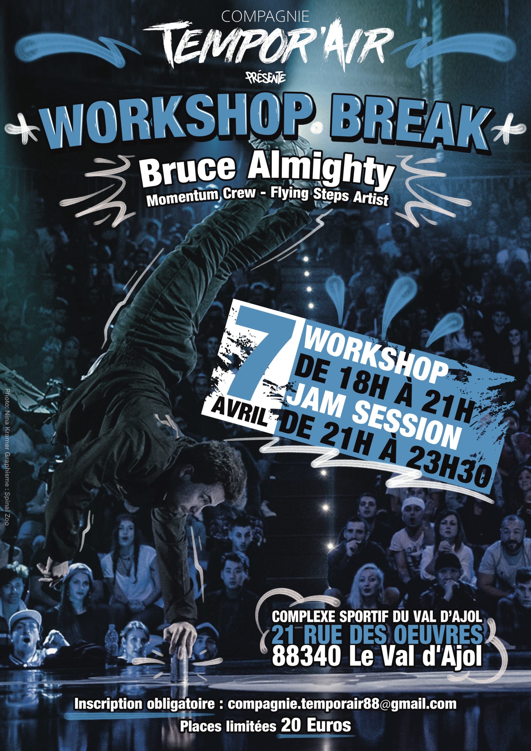 Attention, il n’y aura pas de place pour tout le monde, ce vendredi 7 avril, pour le workshop breakdance organisé par la Compagnie Tempor’Air, à l’occasion de la venue du maître en la matière, Bruce Almighty, reconnu mondialement. Il sera en démonstration et animera un stage exceptionnel au Complexe sportif du Val-d’Ajol, entre 18 h et 23 h 30.