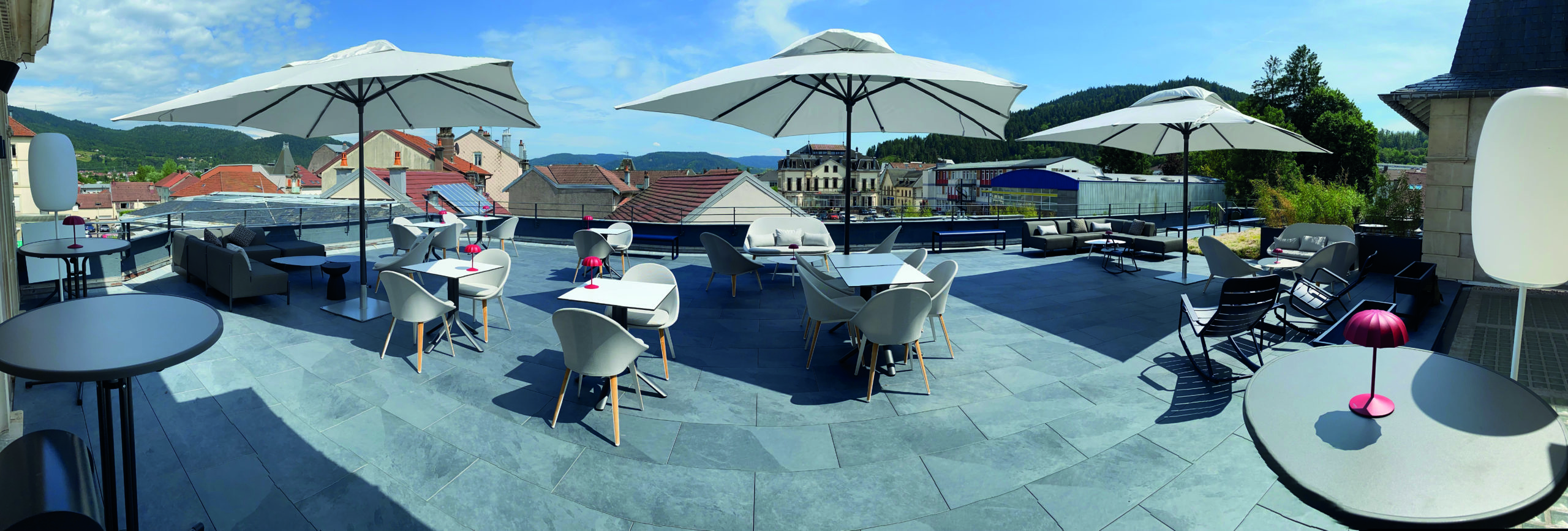 Effectivement, cette grande terrasse d’exception de 150 m2 , idéalement exposée, peut accueillir une quarantaine de personnes. Elle offre une vue à 180° sur Remiremont, ses toits et surtout sur les reliefs du massif des Vosges ! C’est LE spot idéal pour profiter des beaux jours et du soleil à n’importe quelle heure de la journée. Nos clients disent que c’est un vrai dépaysement associé à un confort total grâce à nos différents aménagements : fauteuils, canapés, tables hautes et basses, parasols…