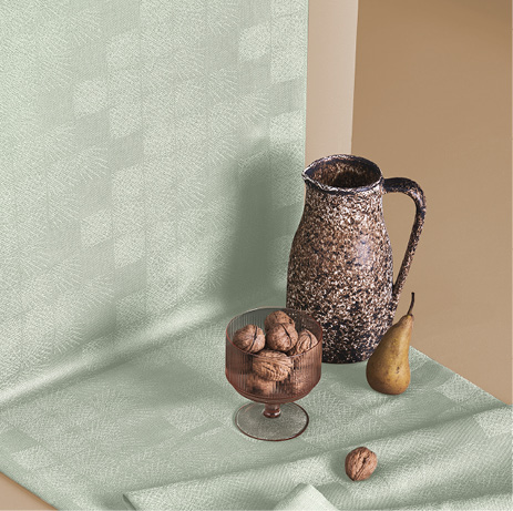 – Nappe et serviette Épis. Voici la version authentique, actuelle et intemporelle du jacquard. Authentique pour son motif délicat et subtil qui évoque les étincelles et joue à cache-cache avec la lumière. Actuelle pour sa légèreté, sa fluidité et sa légère brillance. Intemporelle pour ses coloris neige et verde.