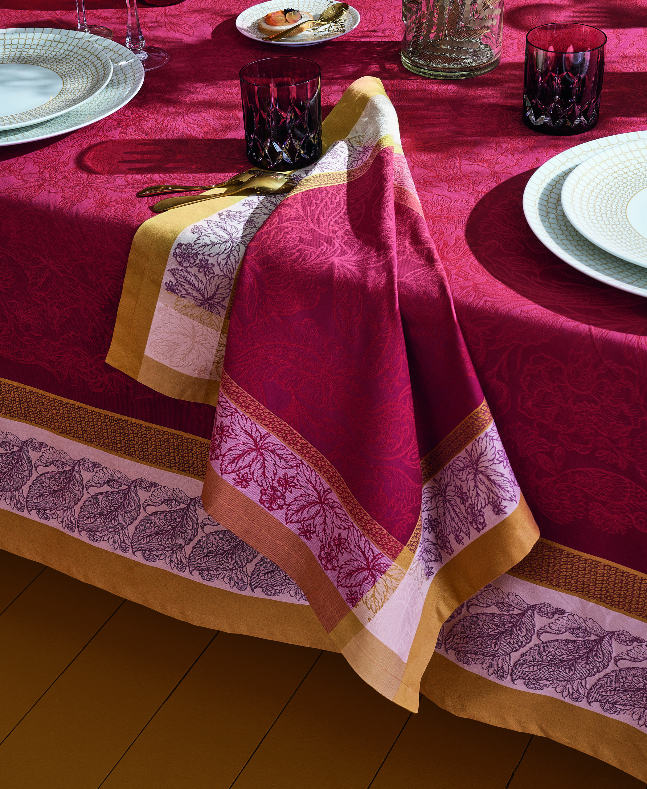 Plongez dans la richesse de ce motif d’indienne aux mille et un détails raffinés. Parez votre table de la luxuriance des damassés aux tons rouge rubis profond et beige doré, et faites de votre réveillon une nuit de merveilles.