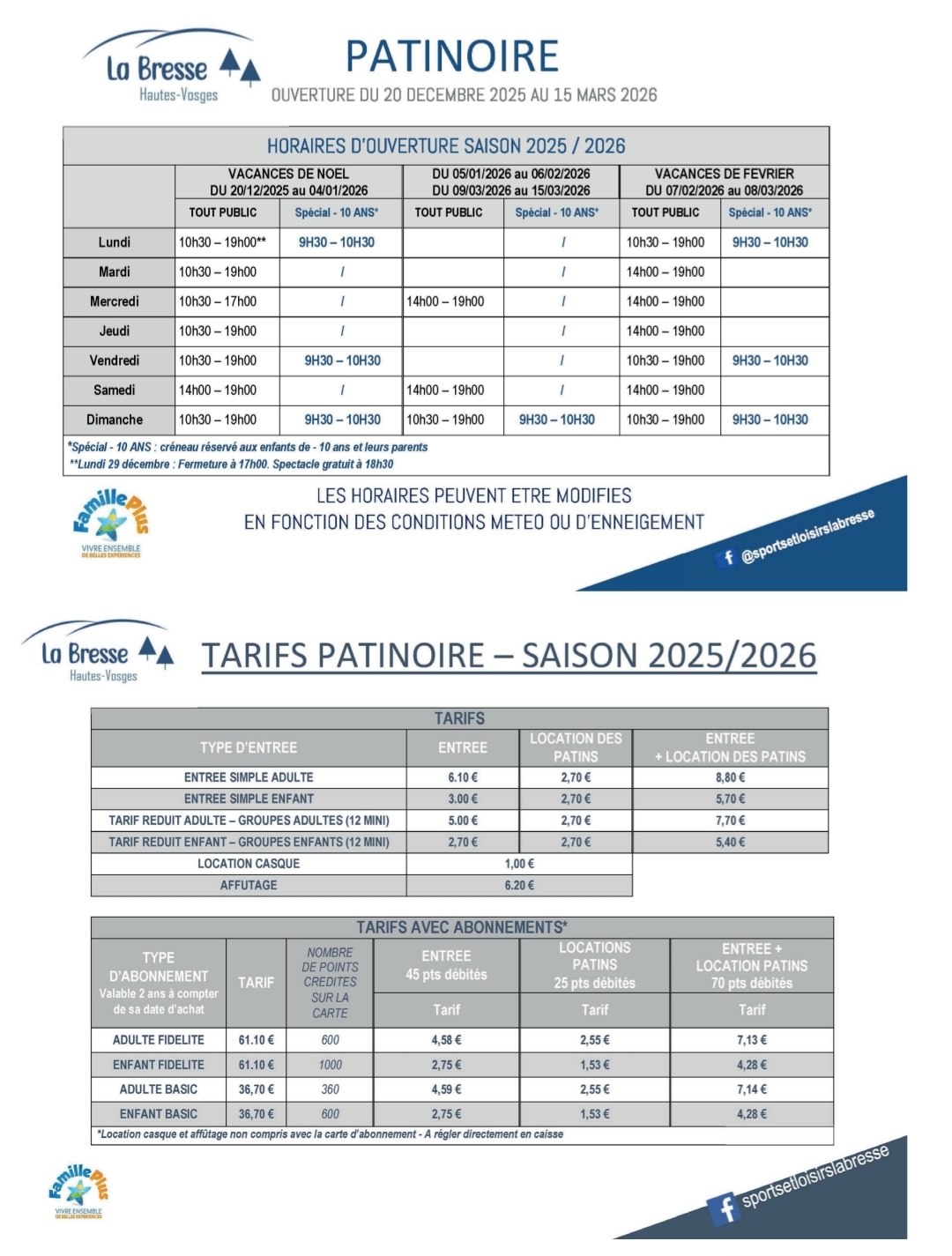 La patinoire sera ouverte au public du samedi 20 décembre au dimanche 15 mars inclus. Pendant les vacances de Noël, elle fonctionnera tous les jours. Des créneaux spécifiques sont également prévus pour les enfants de moins de 10 ans accompagnés de leurs parents, les lundis, vendredis et dimanches de 9h30 à 10h30. L’ensemble des horaires d’ouverture et des tarifs est communiqué par la commune et consultable ci-dessous.