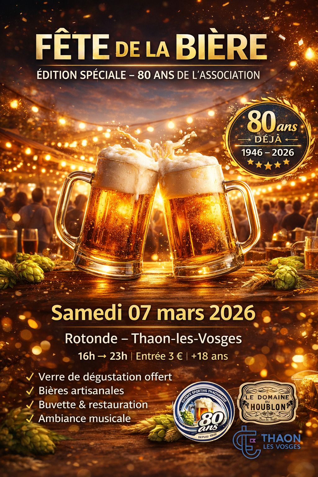 Samedi 7 mars, La Rotonde de Thaon-les-Vosges accueillera la fête de la bière organisée par l’Entente Sportive Thaonnaise. Pour cette édition anniversaire, six brasseurs artisanaux vosgiens seront réunis aux côtés des bénévoles du club, avec au programme dégustations, restauration, animation musicale et présentation d’une cuvée spéciale « 80 ans ». Entrée fixée à 3 euros, verre offert.