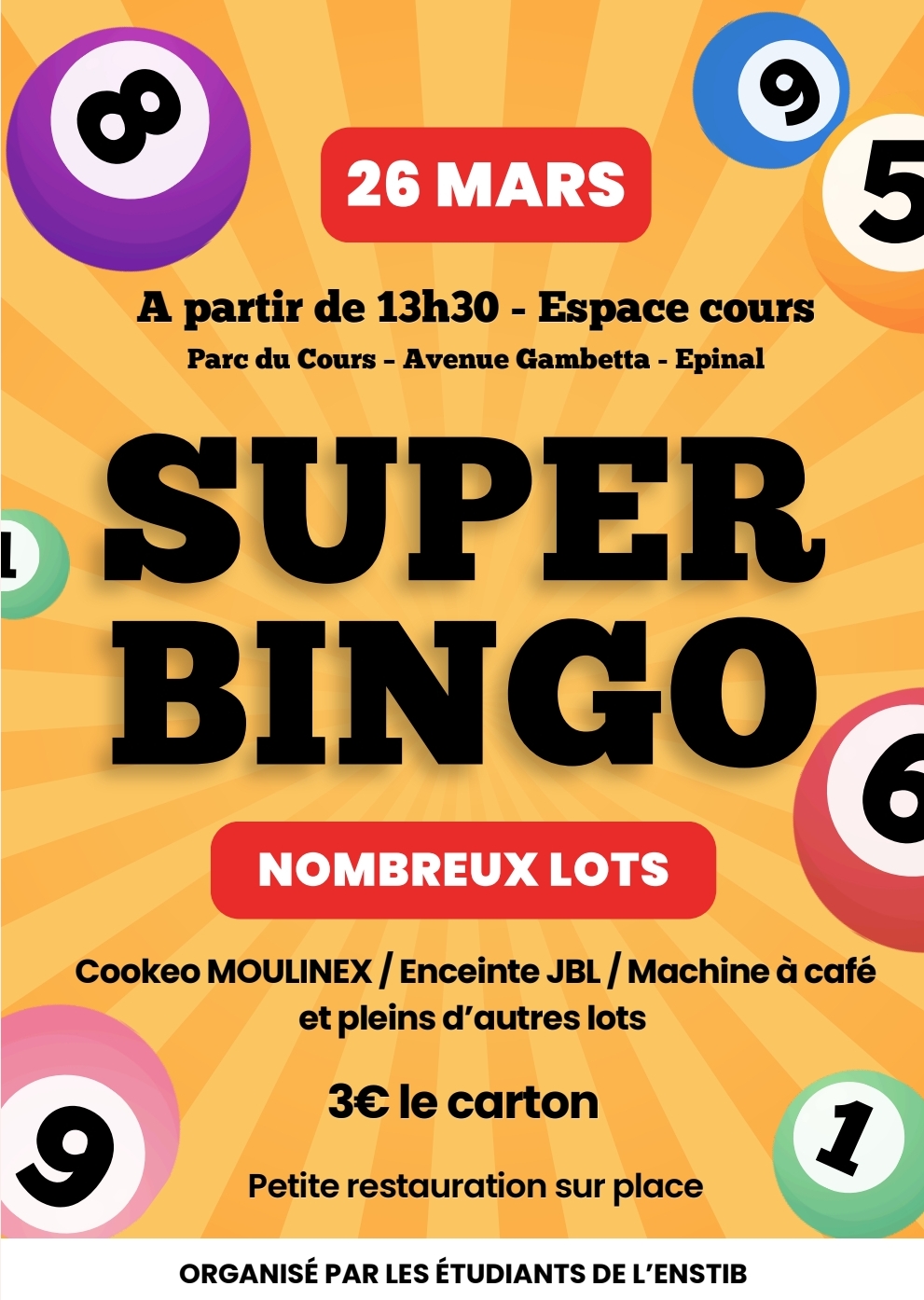 Jeudi 26 mars 2026, l’association des étudiants de l’ENSTIB donne rendez-vous au public à l’Espace Cours d’Épinal pour la troisième édition de son bingo. Ouvert à tous, l’événement vise à soutenir les projets associatifs portés par les élèves de l’École Nationale Supérieure des Technologies et Industries du Bois, tout en proposant un après-midi convivial ponctué de nombreux lots à gagner.