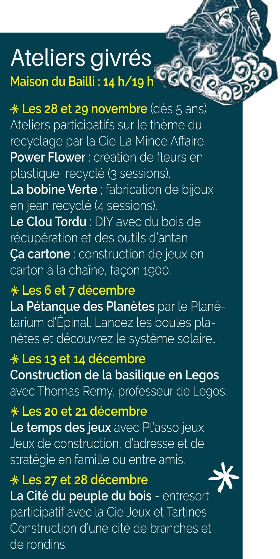 Épinal frappe fort pour lancer ses « Rendez-vous givrés ! ». Pas moins de six compagnies venues de toute la France vont réchauffer l’ambiance hivernale en enchaînant des spectacles toutes les demi-heures ,et quatre ateliers participatifs (voir encadré).