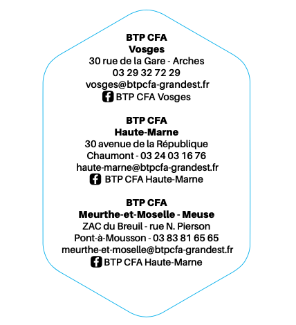BTP CFA Grand Est, c’est 3 Campus proches de chez vous pour des formations diplômantes en alternance dans les nombreuses filières du BTP : Maçonnerie, Toiture, Métallerie, Menuiserie, Plomberie-Chauffage & Climatisation, Électricité & Domotique, Peinture & Plâtrerie, Carrelage & Sol, Travaux Publics, Management & Étude de la Construction.