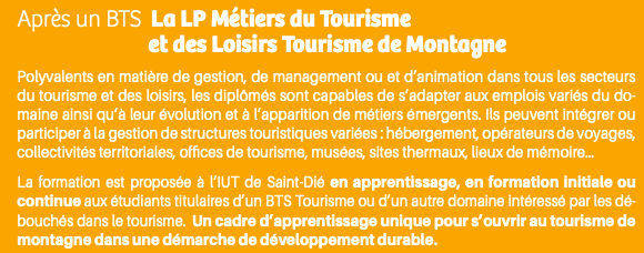 > Formation accessible après un BTS Tourisme, Management d’unité commerciale, Négociation et digitalisation relation client, Support à l’action managériale, Management en Hôtellerie-restauration ; un BTSA Gestion et protection de la nature ou une L2 (ou plus) Histoire, géographie, LEA, gestion, etc…