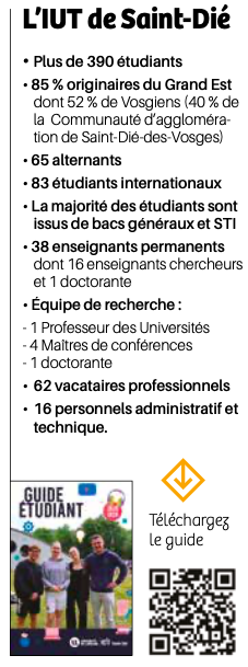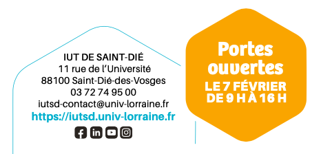Établissement à taille humaine, l’IUT de Saint-Dié fait partie du Collégium de Technologie de l’Université de Lorraine. Il propose des études universitaires à vocation technologique dispensées par des enseignants, des enseignants- chercheurs et des professionnels. Les cours sont organisés en petits groupes, avec un contrôle continu, et sont complétés par de nombreux travaux pratiques réalisés sur des équipements performants accessibles en libre usage. Tourné vers l’avenir, l’IUT s’inscrit dans une démarche de modernisation constante qui lui permet de proposer des formations en adéquation avec les besoins des entreprises.