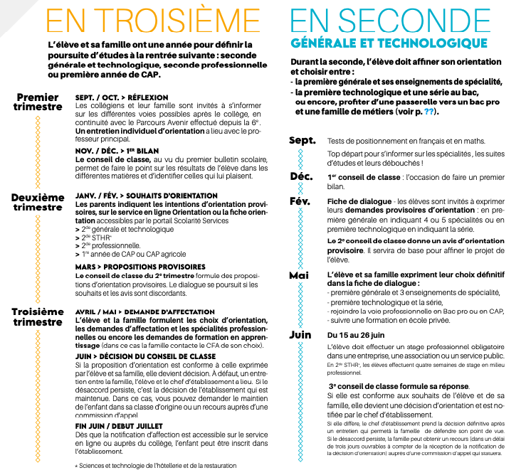 En classe de 3e, les élèves sont amenés, pour la première fois à envisager leur avenir en effectuant un choix d’orientation entre voie professionnelle et voie générale & technologique. Depuis la sixième, ils sont accompagnés dans l’élaboration de leur projet par leurs professeurs notamment. Toutefois, l’intérêt et l’accompagnement des parents sont indispensables pour envisager la voie dans laquelle ils seront le plus en situation de réussite. Voici des repères et des outils.