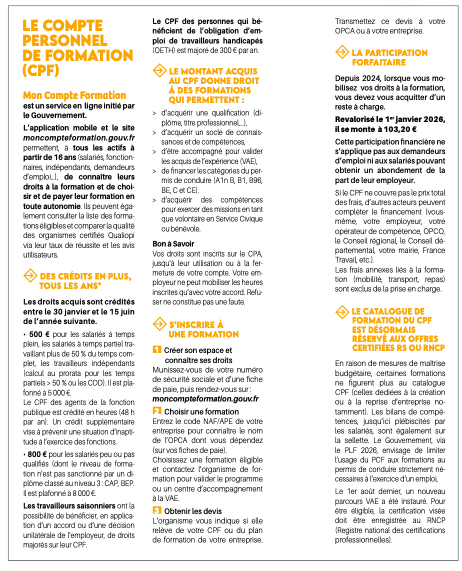 – Le compte personnel de formation ( CPF) qui permet à toute personne active d’acquérir des droits à la formation et de les mobiliser tout au long de sa vie professionnelle.