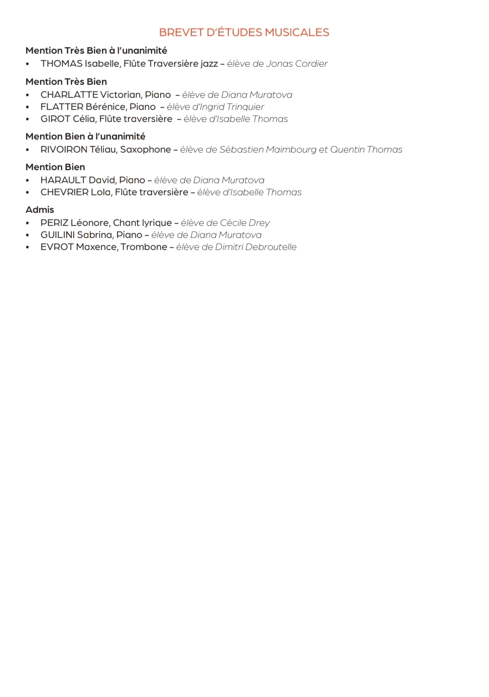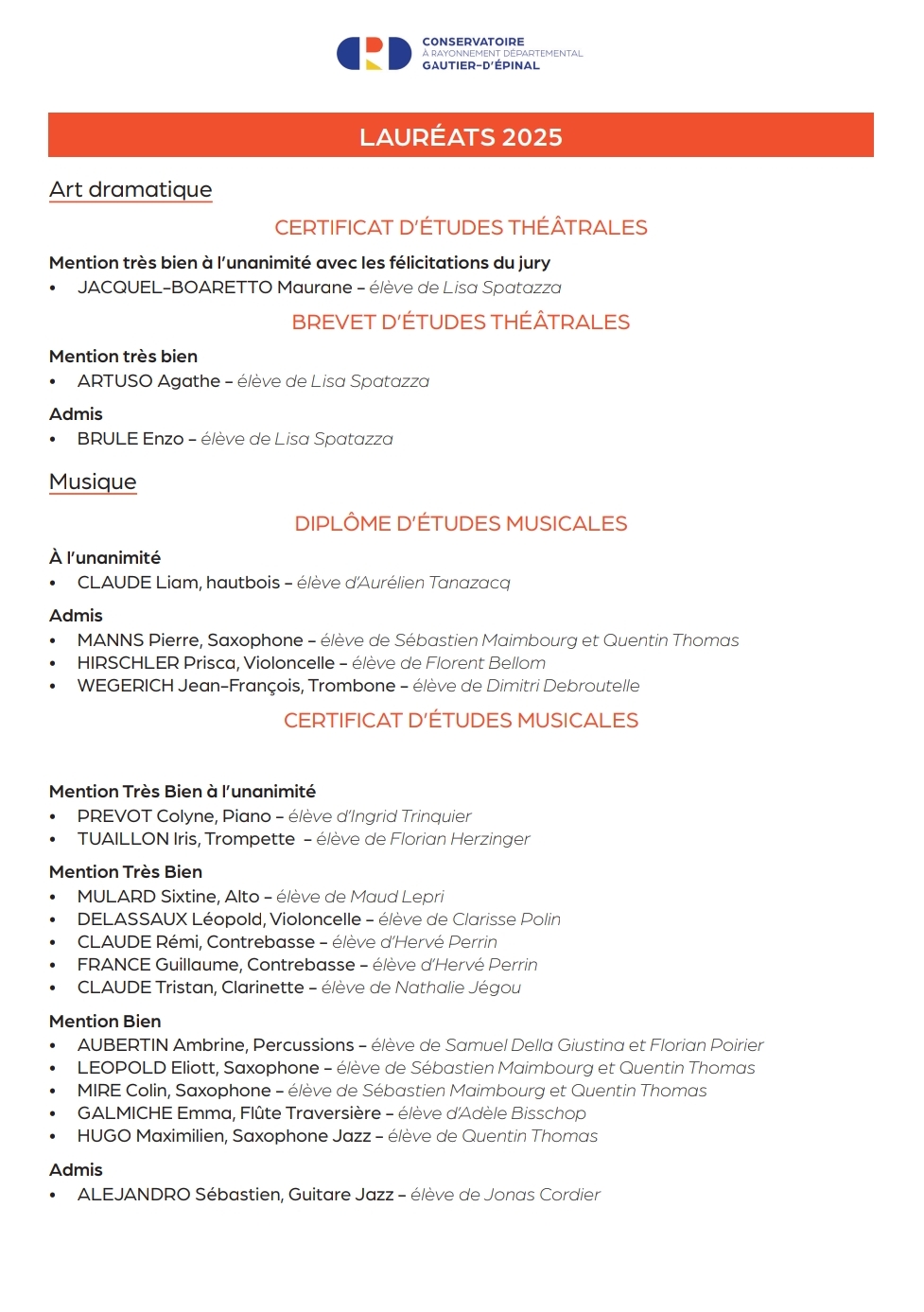 Le Conservatoire mettra à l’honneur trente-six lauréats cette année. Parmi eux, quatre élèves recevront le Diplôme d’Études Musicales, treize obtiendront le Certificat d’Études Musicales, dix se verront remettre le Brevet d’Études Musicales, tandis qu’un élève décrochera le Certificat d’Études Théâtrales et deux autres le Brevet d’Études Théâtrales. Ces distinctions marquent l’aboutissement d’un long parcours de formation, allant du deuxième cycle jusqu’au niveau préprofessionnel.