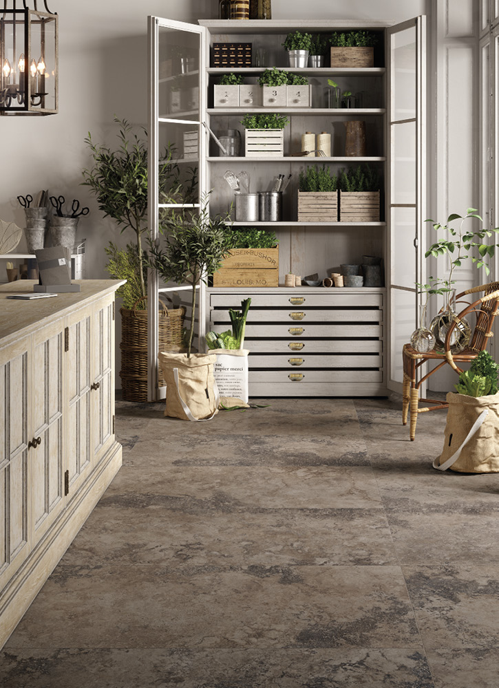 > Chocolate Ancient Naturale – Collection Unique Travertine by Provenza séduit par son aspect vieilli mais sophistiqué.
