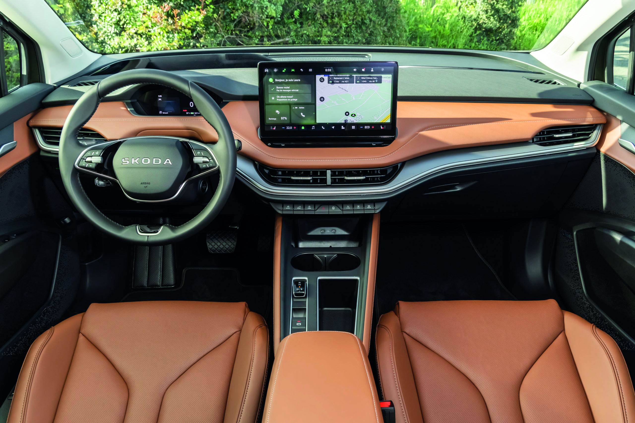À l’intérieur, l’Enyaq séduit par son vaste habitacle, ses lignes épurées et sa qualité de finition. L’es- pace aux jambes à l’arrière est généreux, le coffre est volumineux, idéal pour les voyages ou les usages familiaux. La connectivité est moderne, avec écran large, aides à la conduite, climatisation performante et matériaux soignés. Un vrai SUV qui ne sacrifie ni le luxe ni la fonctionnalité.
