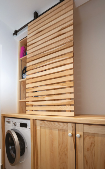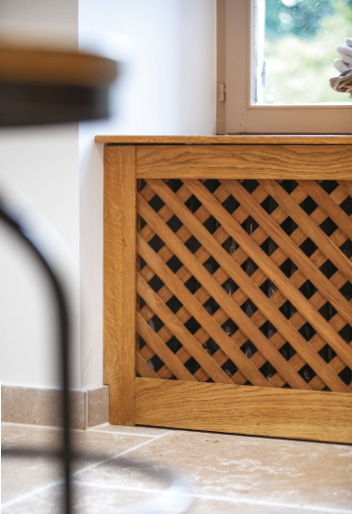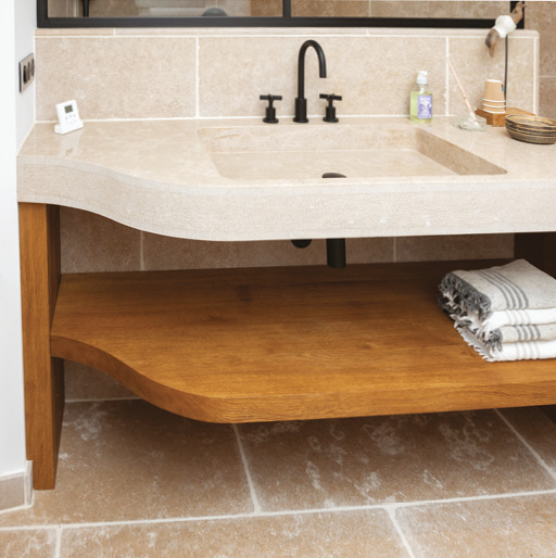 Rénover une maison ancienne requiert savoir-faire et expérience pour déjouer les irrégularités du bâtit autant que pour collaborer avec les autres corps de métiers. C’est particulièrement vrai pour ce meuble qui épouse et soutient, avec une impression de légèreté, cette majestueuse vasque en pierre aux courbes douces réalisée par Sebeler. Une douceur qui fait écho à la finition du chêne huilé à l’éponge, selon un protocole d’ébénisterie.