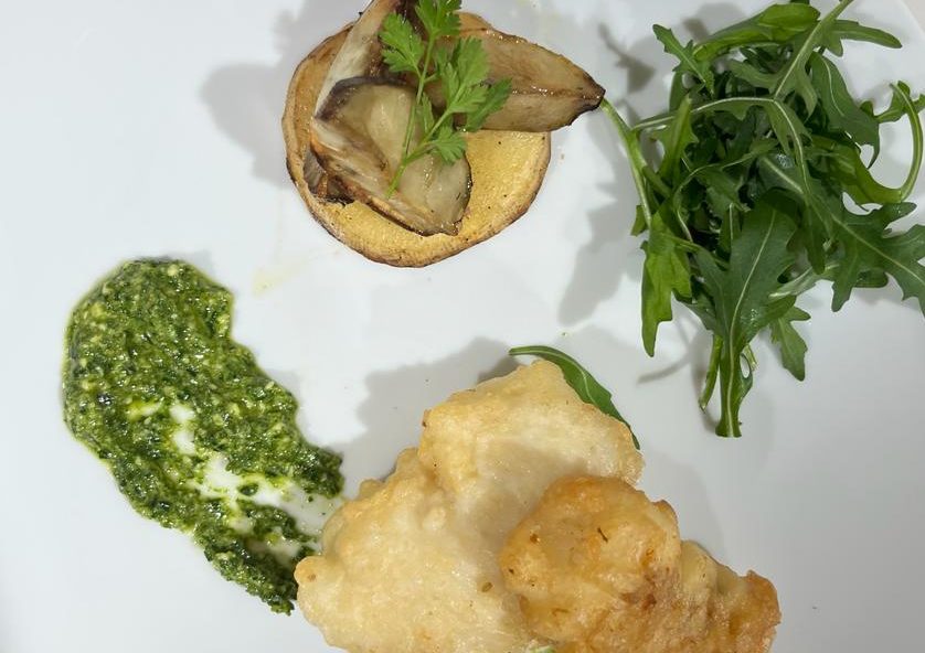Recette : Cerfeuil tubereux roti à la peau, tempura de julienne et pesto de roquette