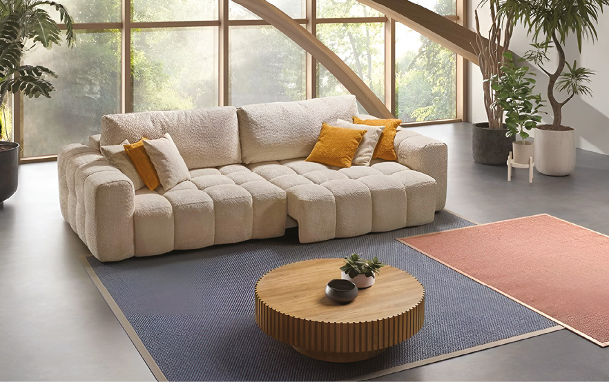 L 302 x H 94 x P 136 cm. Structure en pin et contreplaqué, assise en mousse PU D25kg/m3 et ressorts ensachés. Dossier et accoudoirs en mousse PU D25kg/m3 et flocons de mousse. Suspensions par ressorts nossag. Pieds en plastique noir H 3 cm – coussins d’assise fixes et dossier amovibles. Vendu avec coussins déco. 2 999,90 € (dont éco part. 60 €).