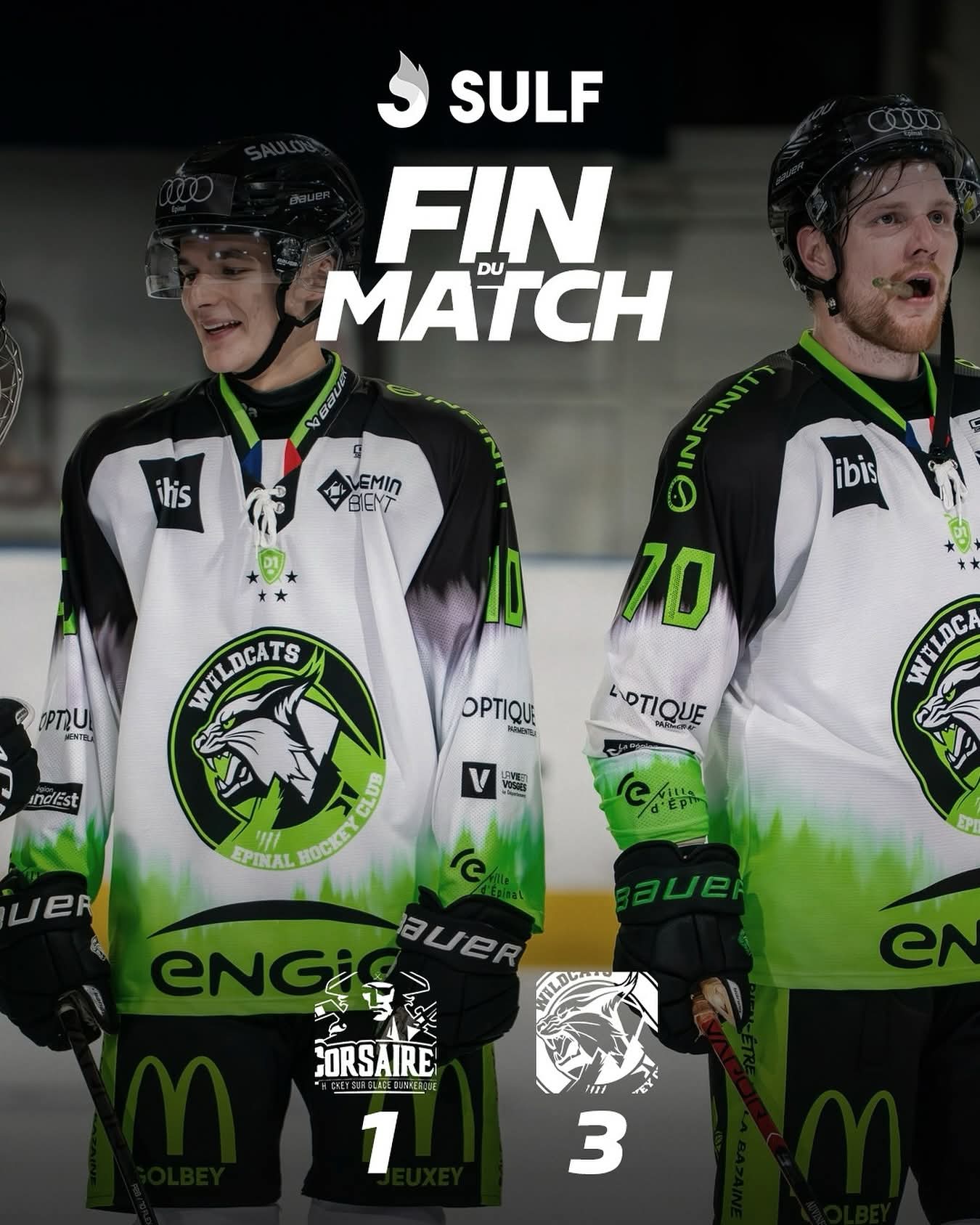 Après une défaite inaugurale aux tirs au but la semaine dernière, les Wildcats d’Épinal ont parfaitement réagi à Dunkerque. Les Spinaliens se sont imposés 3 à 1, portés par un grand Jimmy Darier dans les cages et des réalisations signées Tomas Rusina, Hugo Sarlin et Peter Hrehorcak. Ce premier succès lance la saison des Vosgiens, qui retrouveront leur public samedi prochain à Poissompré face à Villard-de-Lans.