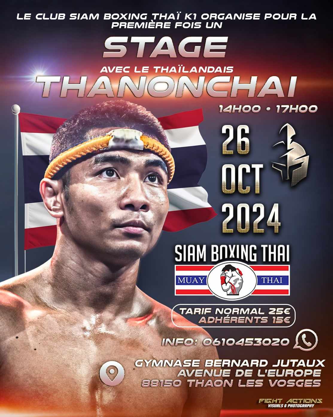 Le 26 octobre prochain, le club Siam Boxing Thai Thaonnais accueille un événement exceptionnel : un stage technique de Muay Thai animé par l’un des plus grands champions thaïlandais de la discipline, Thanonchai. Organisé sous l’impulsion de Charly Méphon, président du club, ce stage promet d’être un moment fort pour les passionnés de cet art martial.